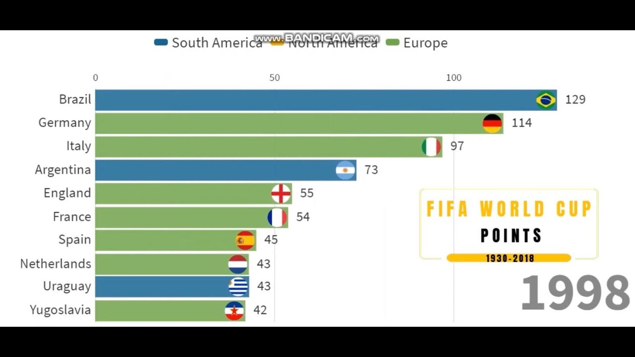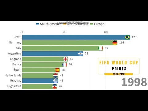 The accumulation of points earned by various FIFA World Cup teams from the first edition in 1930 to the latest edition 2018. Interesting trends can be seen from this bar chart race, let’s discover! Feel free to leave comments here and support your favourite teams! Every like and comment is important support to my video ;-)